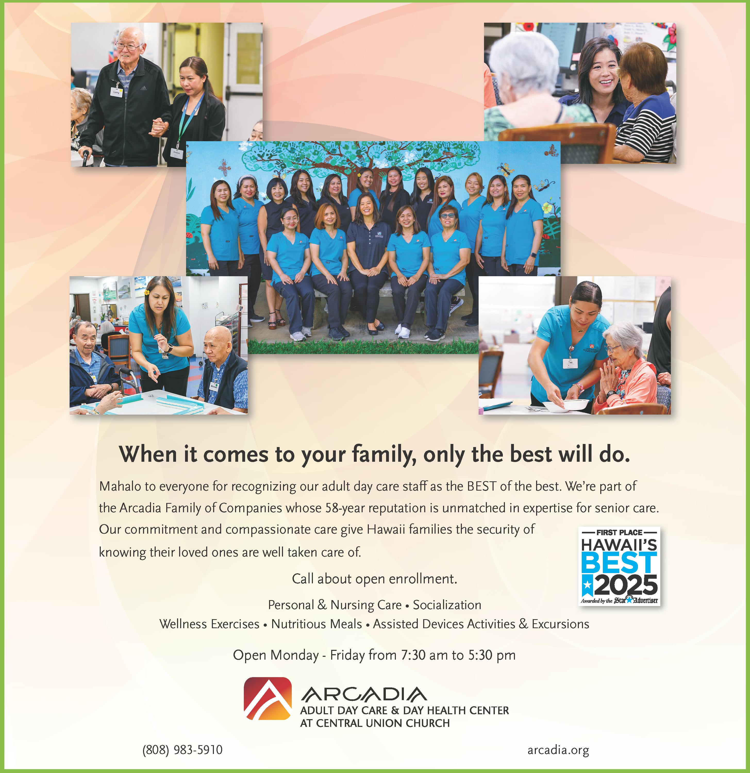 At Arcadia Adult Day Care & Day Health Center at Central Union Church in Honolulu, clients are offered a healthy balance of physical and mental exercises in a setting that encourages socialization. Every day includes delicious meals, socialization and exercise. Plus, clients also benefit from a varied list of fun and stimulating activities that change daily.