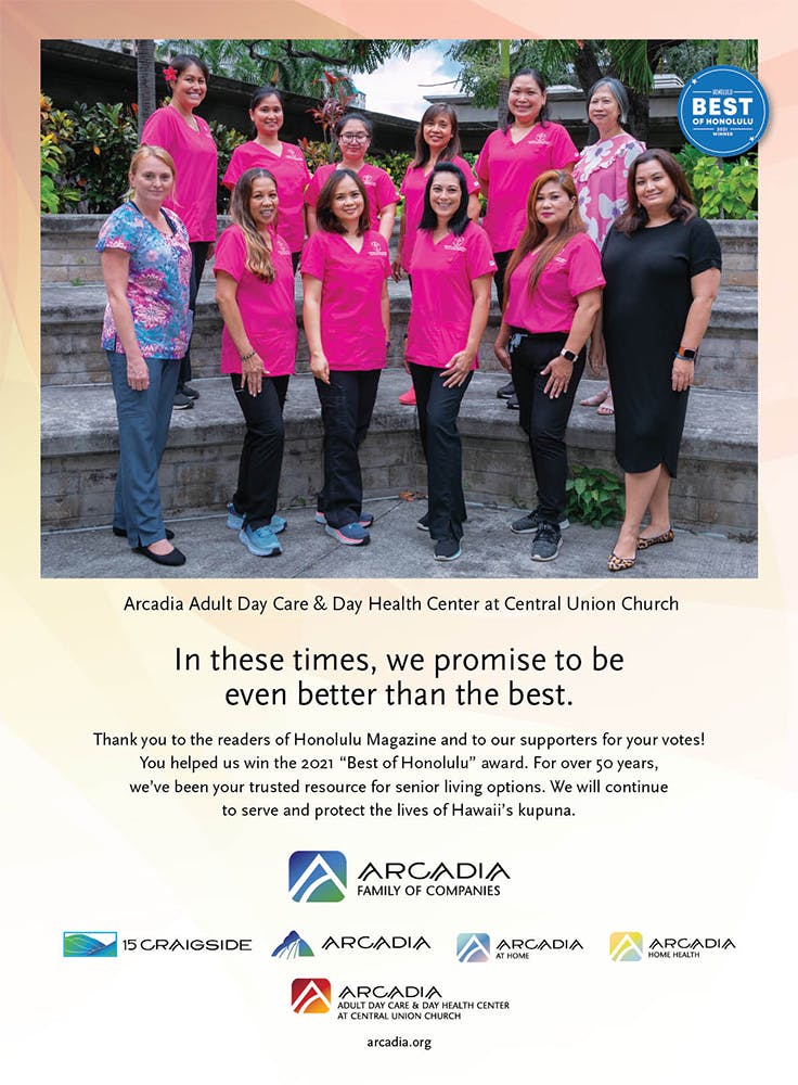 Thank you to the readers of Honolulu Magazine and to our supporters for your votes! You helped us win the 2021 “Best of Honolulu” award for the “Best Adult Day Care!” The results are published in the July/August issue of Honolulu Magazine. Congratulations to Jennifer Souza, Program Director, and her hardworking team at the Arcadia Adult Day Care and Day Health Center at Central Union Church for being “even better than the best!” Thank you for always providing excellent care to our clients.