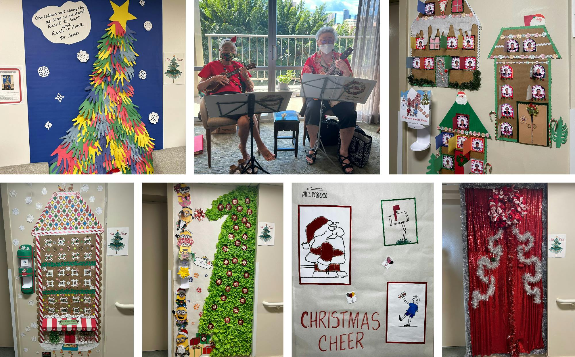 During the open house, 6th floor residents provided refreshments of pastries, rum punch and regular punch as well as entertainment for those that stopped by. Residents Ms. Amy Taniguchi (top center photo, left) and Ms. Lauretta Gum (right) played the ukulele and sang Christmas songs to put everyone in the holiday mood!