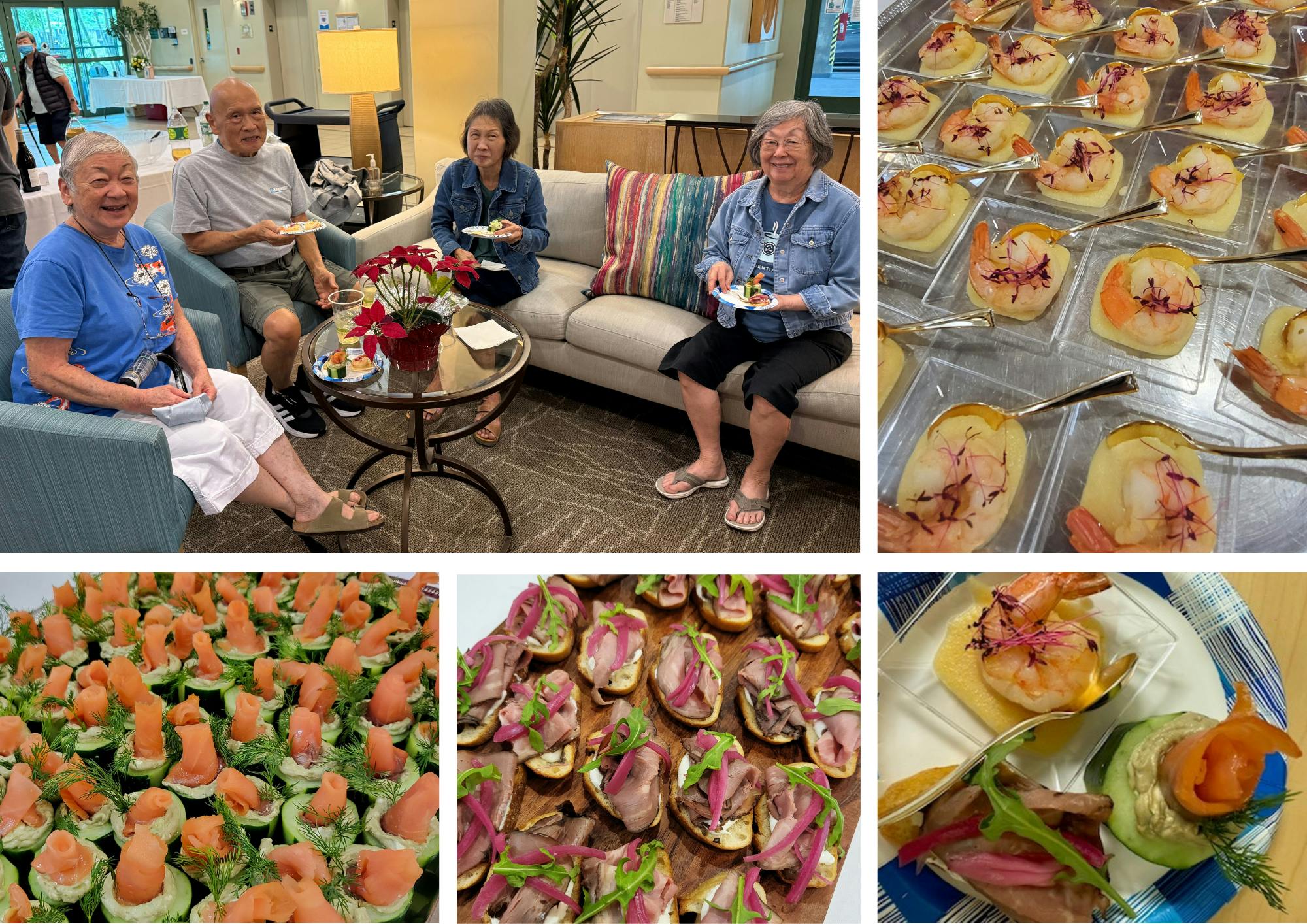 The 15 Craigside Na Mea Ono (The Delicious Place) Cocktail Hour was filled with great food and even better company. Residents enjoyed a selection of mouthwatering creations, including Roast Beef Crostini and Shrimp and Grits, which brought a comforting, southern-inspired flavor that was both rich and satisfying. The Smoked Salmon on Cucumber with avocado hummus offered a light, refreshing bite with a creamy finish. Musician Scotty entertained with local tunes on his ukulele.