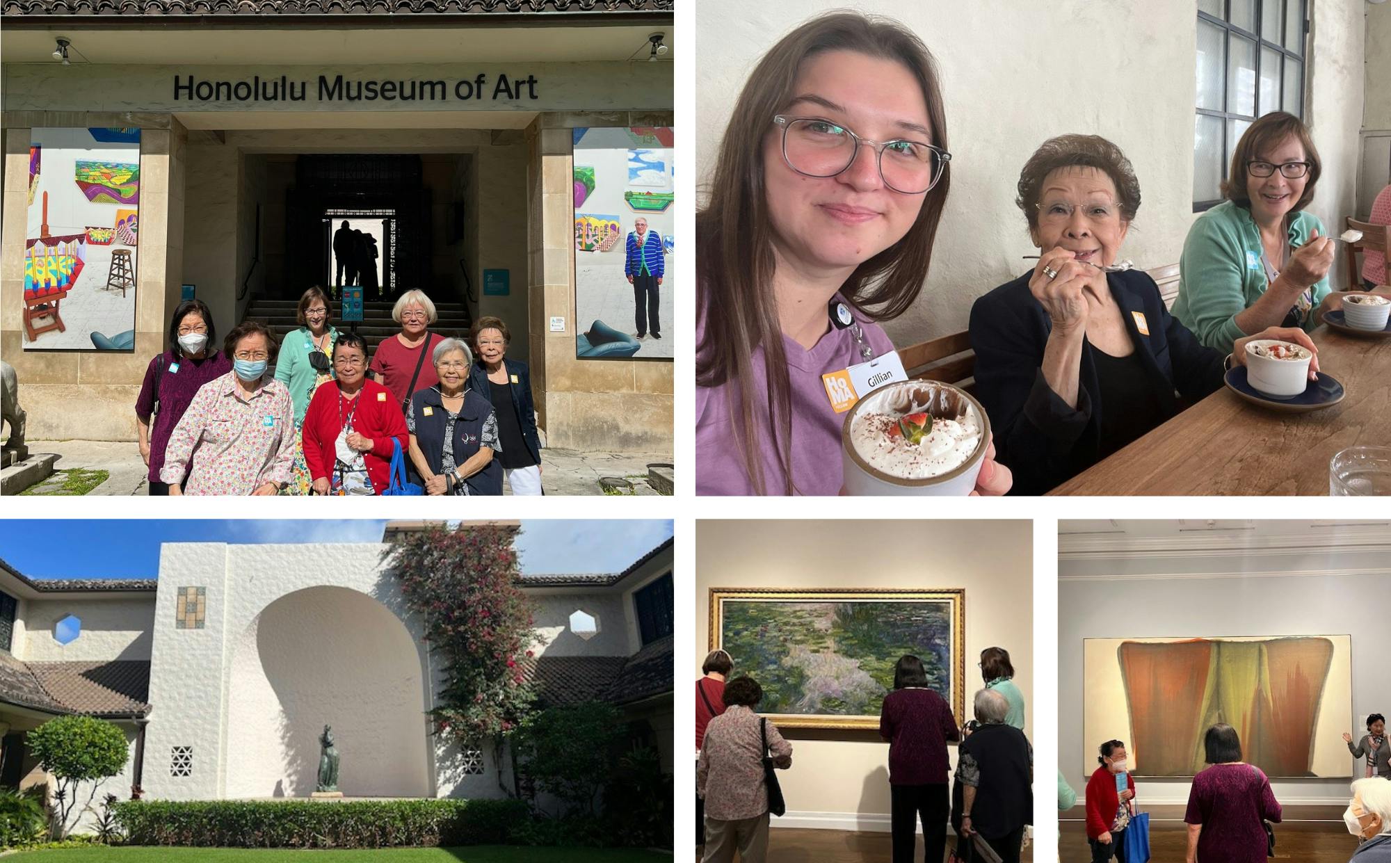 Arcadia residents took a trip to the Honolulu Museum of Art (HoMA) to experience art, history, and culture. They explored the beautiful greenery of the outdoor grounds and regional architecture of the courtyard. Everyone loved seeing all of the unique exhibits and learning about the individual works. They also stopped at the museum’s café for a refreshing and yummy lunch. The café has been there for over 50 years, serving casual contemporary cuisine to perfectly complement the experience of the tour. HoMA currently has a few pop-up exhibitions including David Hockney: Perspective Should Be Reversed, Prints from the Collections of Jordan D. Schnitzer and His Family Foundation, Navid Sinaki: The Infinite Garden, Shining Prince: The Tale of Genji, and Disasters of War: Then and Now.