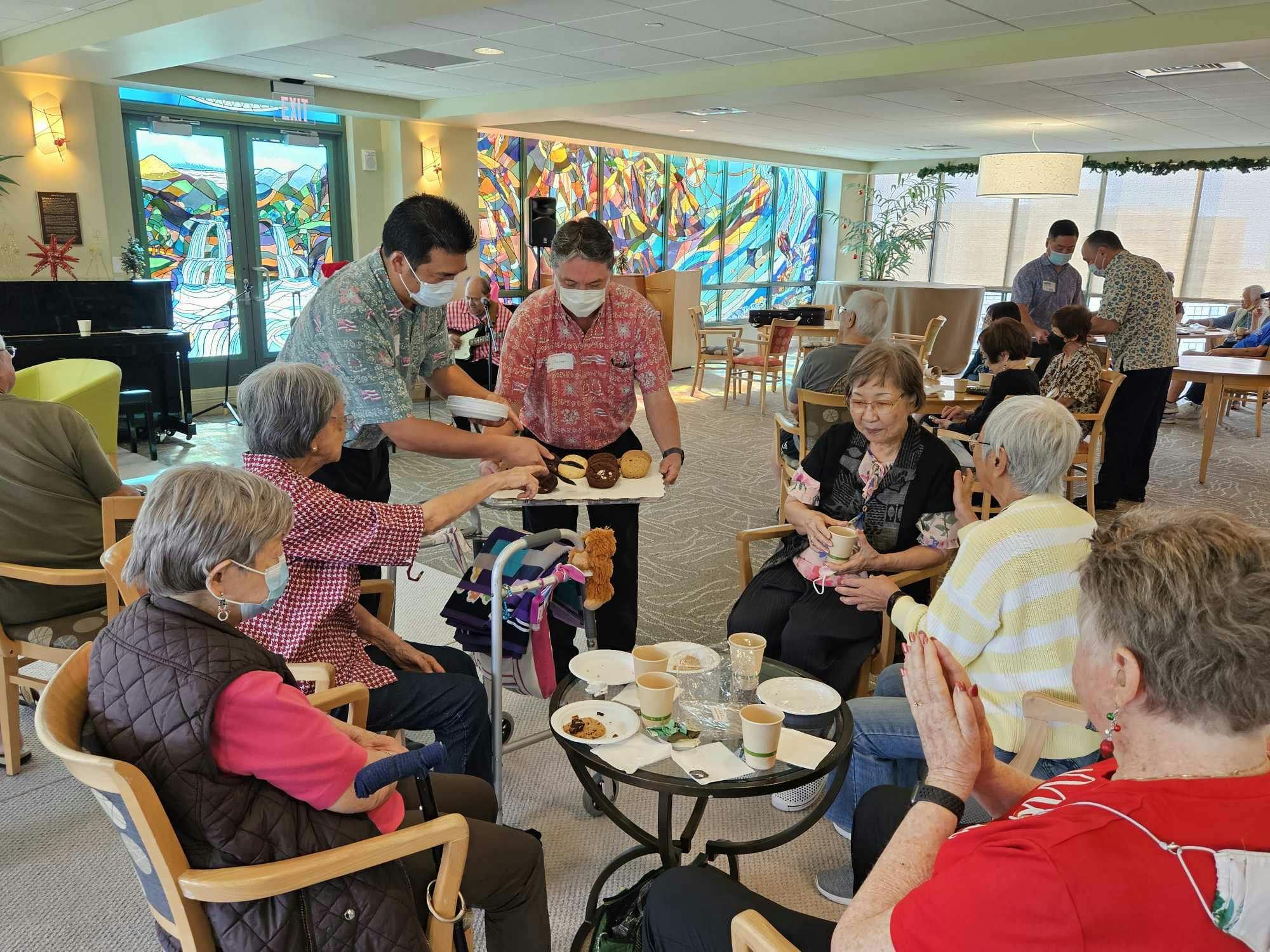Wishing our residents a happy holiday season filled with peace and love, First Hawaiian Bank (FHB) visited 15 Craigside for their annual Holiday Tea. Held in the Solarium, FHB staff served delicious refreshments of cookies and beverages, while musicians entertained with melodious tunes on the ukulele and guitar. FHB gave away fabulous raffle prizes to lucky residents and Santa came by to spread holiday cheer!
