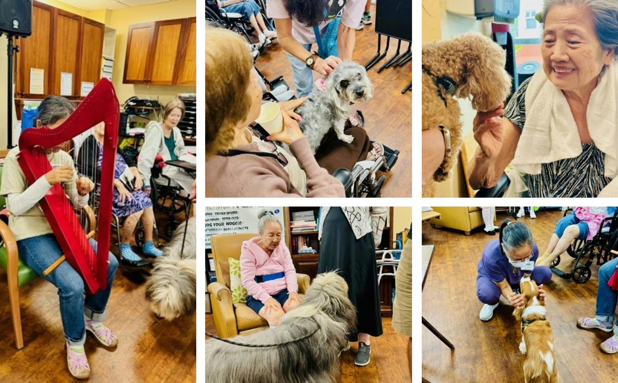 To celebrate National Pet Day on April 11th, Hale Ola Kino collaborated with One Kalakaua for a pawsome gathering. Pets and their humans visited the residents to bring smiles, share affectionate belly rubs, and enjoy some precious doggie kisses! One of the visitors showcased her remarkable harp playing talent, treating everyone to soothing melodies. Even the staff couldn't resist the charm of these furry visitors!