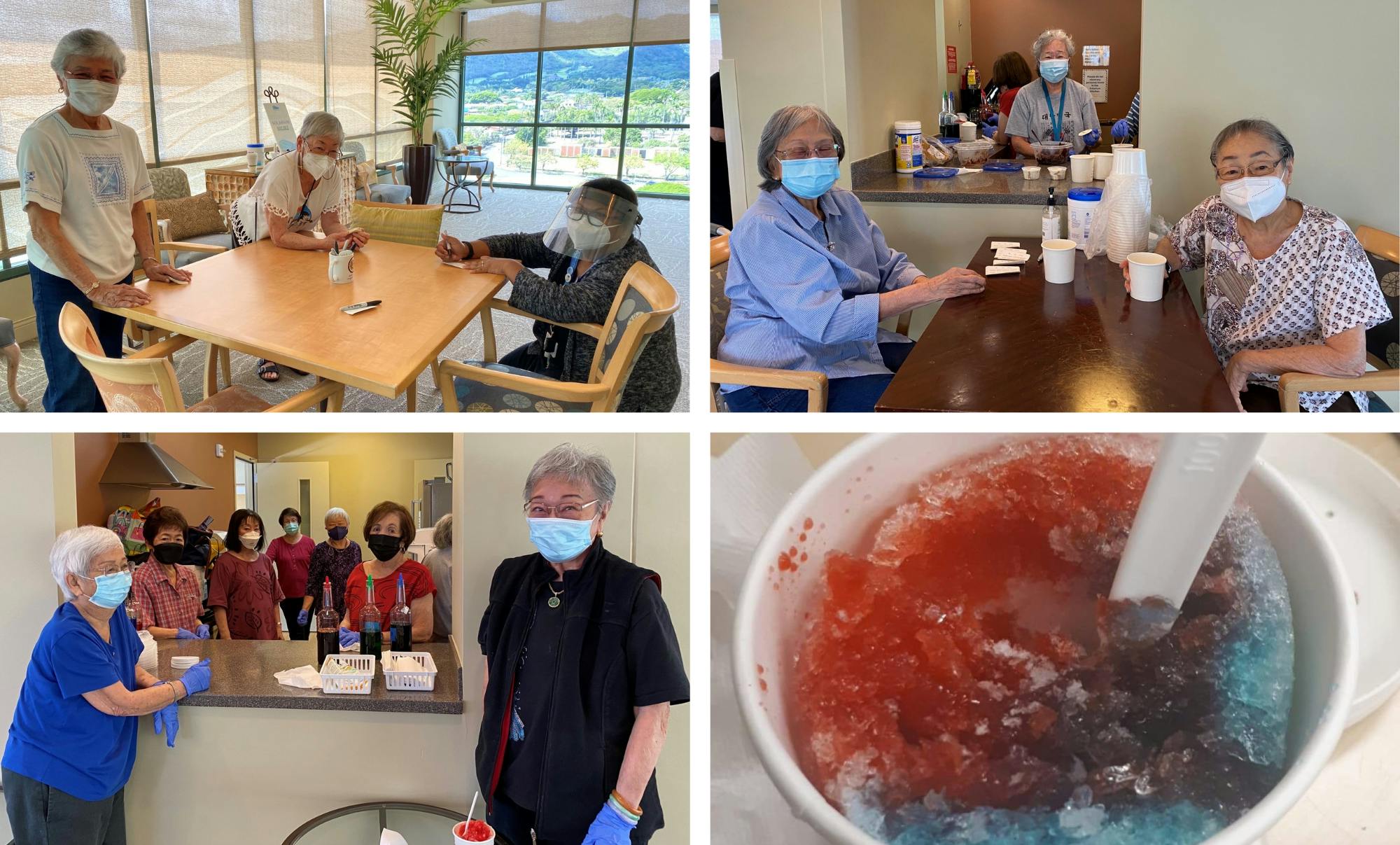 15 Craigside kicked off summer and beat the heat with a refreshing afternoon shave ice treat. The shave ice stand in the Solarium was an organized resident-run operation. Residents and employees placed and picked up their custom orders with filling choices of ice cream and azuki beans, and an assortment of flavors including strawberry, vanilla and melona. Sugar-free options were also available in strawberry, vanilla and banana flavors. Shave ice in the islands traces its roots back to Hawaii’s plantation days. Japanese immigrants, who came to the islands in the mid-1800s to work in the pineapple and sugar fields, introduced kakigori, which means shaved ice. To cool off, the Japanese immigrants used their tools to shave flakes off large blocks of ice, and then coated it with sugar or fruit juice. In Pidgin English, it became known as shave ice - not shaved ice.