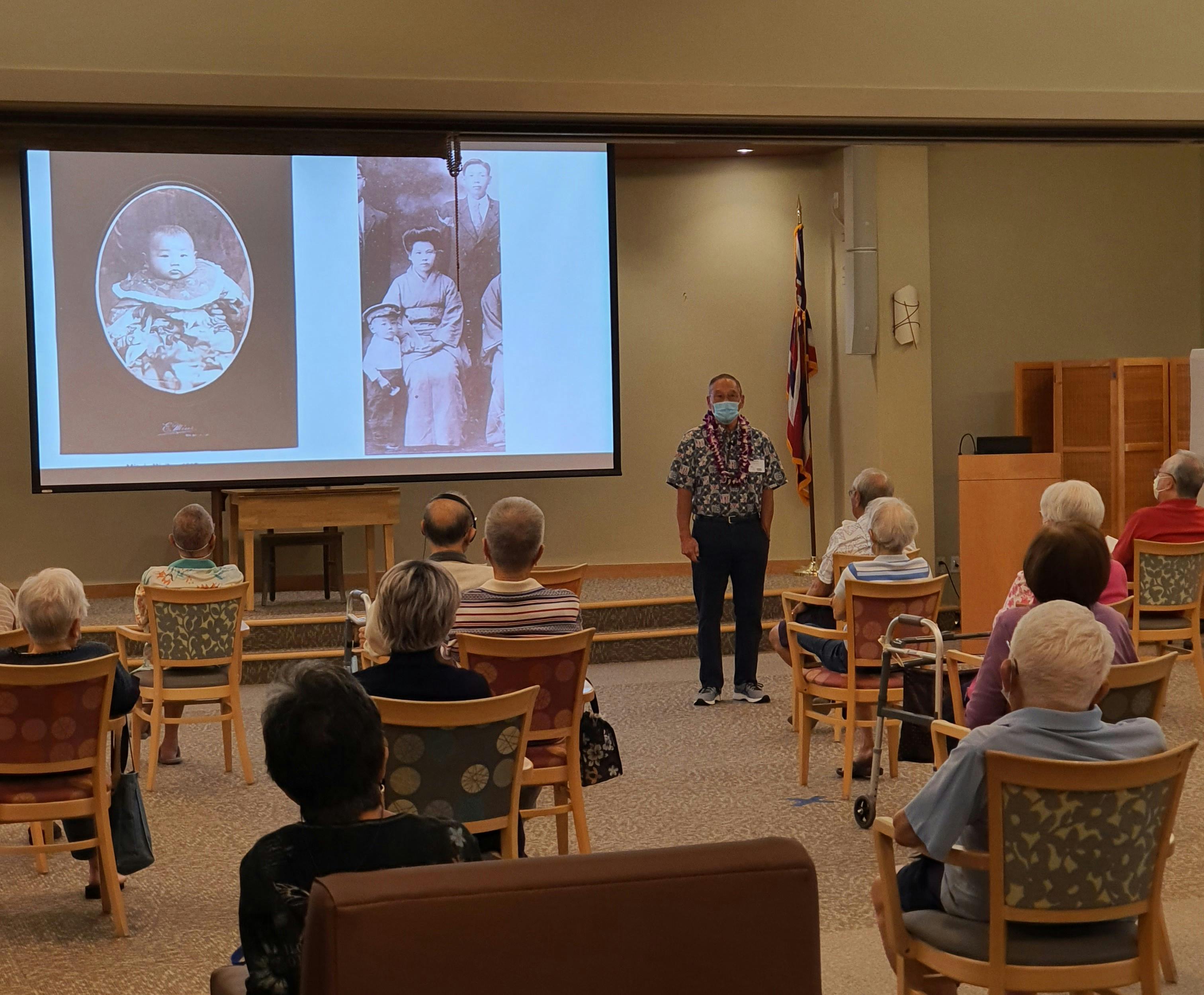 15 Craigside residents attended a presentation by guest speaker, David Fukuda, on the 100th Infantry Battalion and 442nd Regimental Combat Team. He recounted his father, Mitsuyoshi Fukuda’s battles in Italy during 1943-1945. Major Fukuda was the first Nisei (second generation) to become a field grade officer in the U.S. Army Infantry, and the only Nisei and last commanding officer of the 100th Infantry Battalion. David shared seven instances where he was able to discover the exact time and place his father was during the Italian campaign. ”Go For Broke” was the motto of the 442nd Regimental Combat Team, an Army unit composed of Japanese Americans from Hawaii and the mainland United States. For high-rolling gamblers in 1940s Hawaii, it was slang for “shooting the works,” or risking it all for the big win. For the Nisei soldiers, “go for broke” meant they would put everything on the line to win the war against the Germans in Europe and the war against racial prejudice at home.
