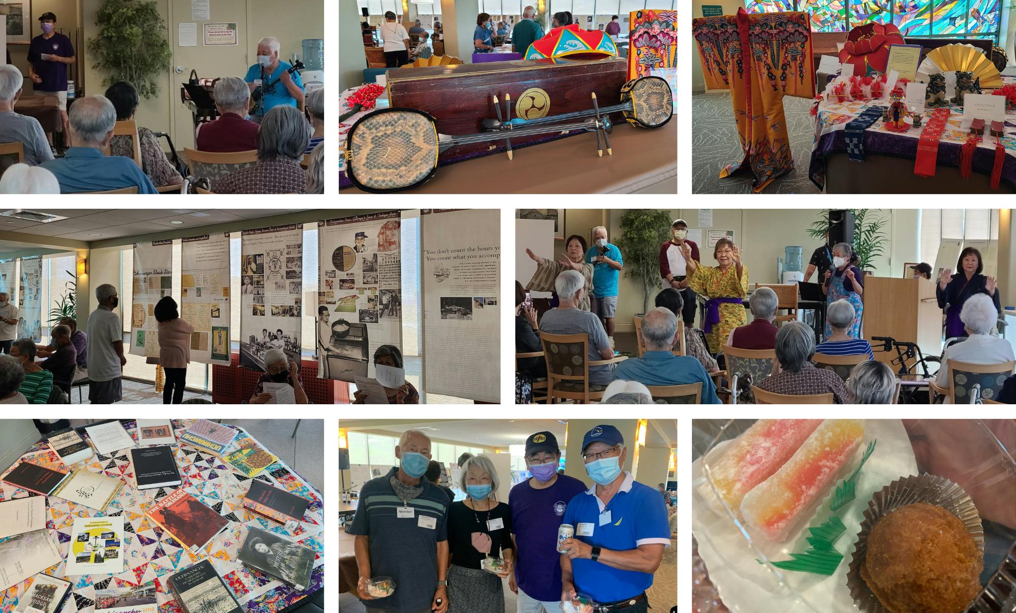September’s Aloha Hour at 15 Craigside had an Okinawan theme, organized by the 9th & 10th floors. A display of banners and posters transformed the Solarium for residents to learn about Mr. Gene Kaneshiro’s Okinawan Family-Owned Restaurant Project. Books on Okinawa from the 15C Library; a dance kimono, hanagasa head ornament and dance implements from Mrs. Sharon Shiraki; and two special sanshin (three-stringed instruments) courtesy of Mr. Joe Imai were also featured. Residents heard more about the Okinawan Family-Owned Restaurant Project from cybrarian Shari Tamashiro, learned about awamori and Mana-Su (Okinawan super vinegar) from Randy Kuba, and enjoyed Okinawan music by sanshin player Dexter Teruya. A special Okinawan dance was performed by Mrs. Kyoko Hijirida, Mrs. Sharon Shiraki and Mrs. Ruth Tokumaru. In conclusion, residents partook in Kuba Awamori distilled spirits, Mana-Su, Beer Lab and Orion beers, nantu (mochi) and andagi (donuts)!