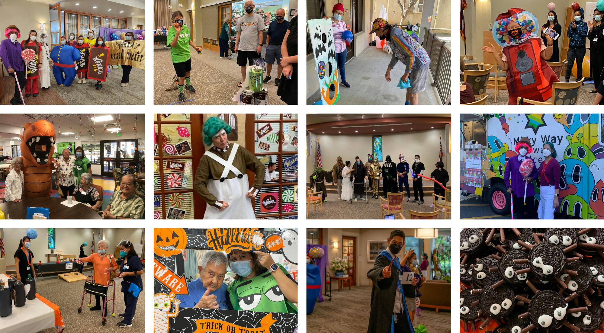 15 Craigside, Arcadia and the Arcadia Adult Day Care Center were filled with frightful fun on Halloween! 15 Craigside was “Out of This World” as residents and staff came to play games and collect candy along the way at the Galaxy Candy Crawl. At the end, everyone was able to pick a prize and leave a winner! Residents also enjoyed the employee parade of costumes including Star Wars, the solar system, Bumblebee from the Transformers and more. At Arcadia, the theme was “Willy Wonka and the Chocolate Factory.” Staff dressed as characters from the movie strutted on the runway for residents to view and vote for their favorites. Milky Way Hawaii Ice also made refreshing drinks for all to enjoy as a Halloween treat. The festivities continued over at The Center with a Halloween party filled with games, prizes, a photo booth, and snacks including Oreo spiders!