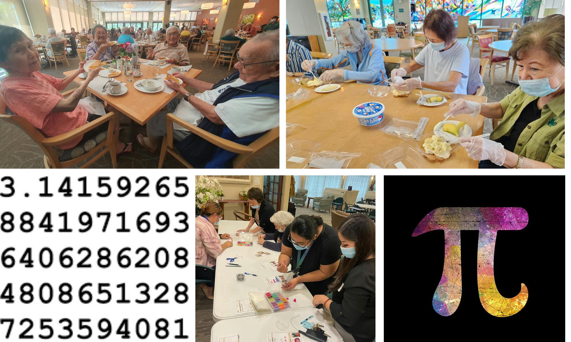 15 Craigside and Arcadia celebrated National Pi Day with some fun festivities! Residents at 15 Craigside made deconstructed banana cream pies. They layered vanilla wafers, vanilla and banana pudding, and topped it with whip cream and banana slices. In addition to the activity, residents enjoyed a pie service with a slice of pear peach pie from Hawaiian Pie Company in the Dining Room. Arcadia celebrated the day making pi themed bracelets. Residents and staff were invited to make their own unique accessory using colorful beads. Participants picked their colors and number of beads based off of the digits of pi (3,1,4,1,5,9). National Pi Day is an annual celebration of the mathematical constant and is observed on March 14th since three, one, and four are the first three significant figures of the symbol. What exactly is pi? Pi is the ratio of a circle’s circumference to its diameter. After measuring circular objects for thousands of years, it has been determined that a circle is a little more than three times its width around, hence the infinite value as seen above in the bottom left photo.