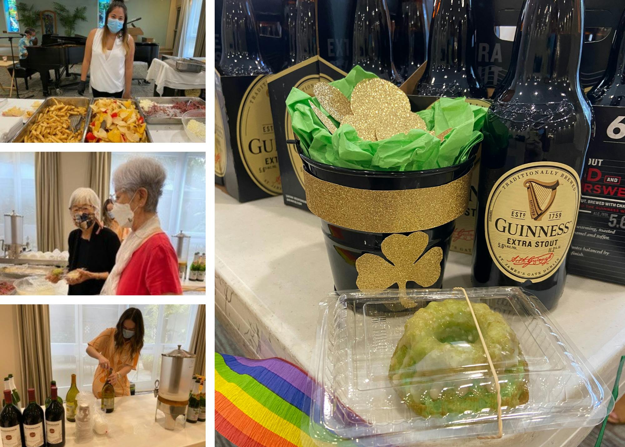 Arcadians virtually celebrated Aloha Hour with a St. Patrick’s Day theme on March 18th to meet new residents and celebrate this month’s birthdays. Residents were served a green bundt cake with a decadent Baileys Irish Cream glaze in the spirit of the holiday, and the pupu consisted of corned beef atop their choice of fries or chips. In addition to wine and sparkling cider, Guinness beer was also offered to complement the theme. It was a festive celebration that also included special guest, pianist Terry Tom! Residents enjoyed the live music while picking up their food and beverages in the Chapel decorated with shamrocks, rainbows and pots of gold.