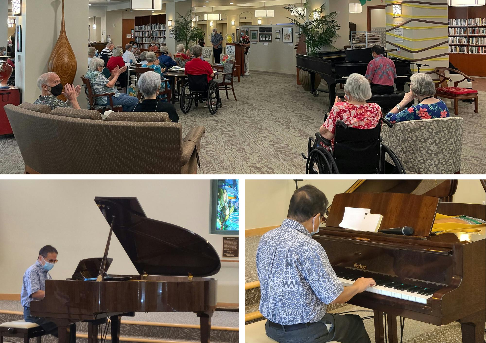 Arcadia’s monthly Aloha Hour is back in-person and residents couldn’t be more excited! Last Friday, residents gathered in the Main Lounge for some fun festivities. Arcadia Resident Association (ARA) President, Mr. Ed Kimsey, introduced the new residents and celebrated May birthdays. Pianist Terry Tom provided the entertainment by playing music for everyone to enjoy. Programs and Dining Services worked together to create a menu based off of the theme, which was Pool Party. They served pupus, wine, and sparkling apple cider options for residents to take home. Aloha Hour is a great opportunity for residents to sit back, relax, and enjoy each other’s company.