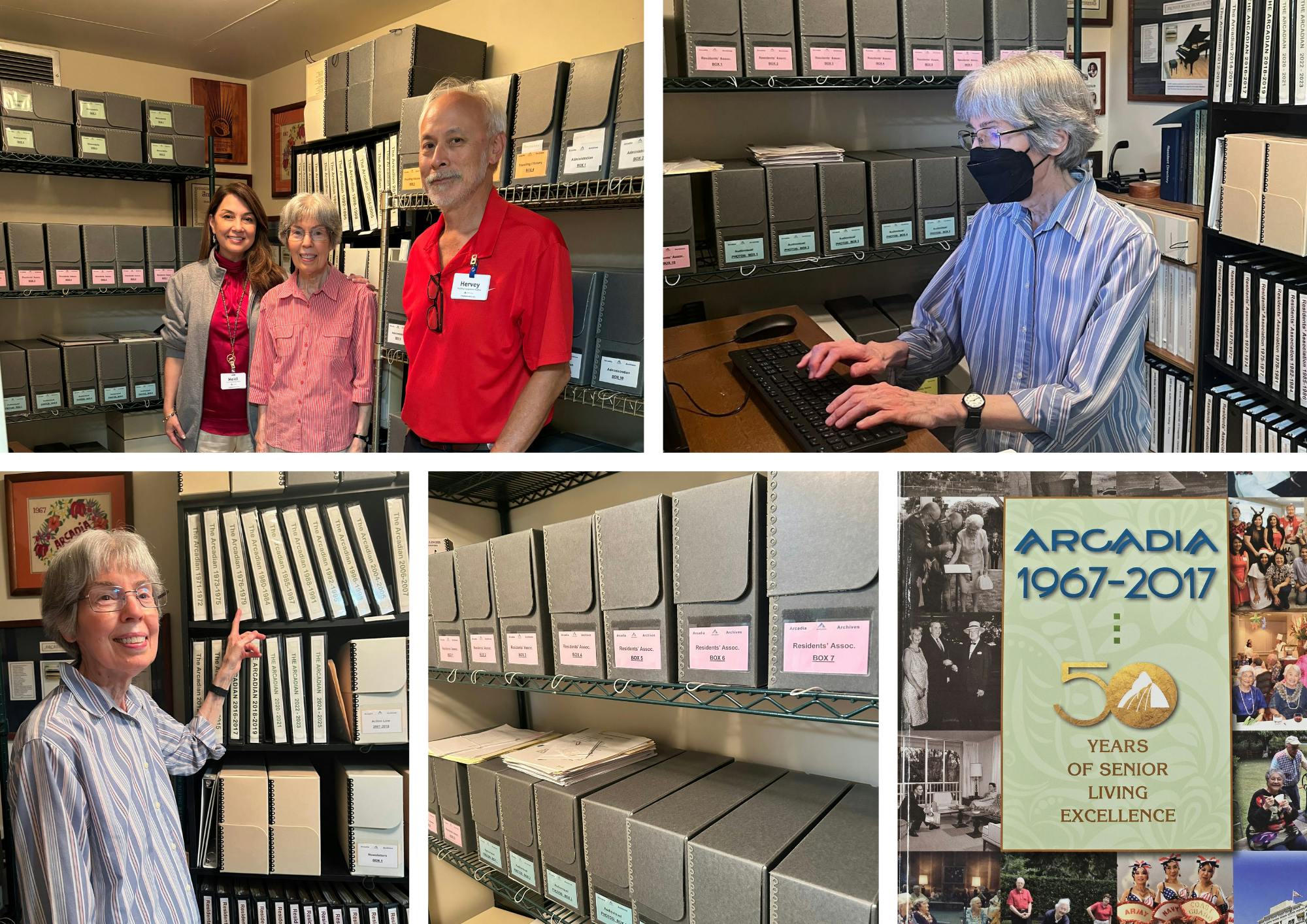Since 2010, Arcadia resident Mrs. Ellen Chapman has served as the Arcadia Family of Companies Archivist, ensuring the preservation and accessibility of valuable records and archives. With 25 years of experience, she also works part-time at the University of Hawaii at Manoa. Initially asked by former President and CEO Emmet White, she has transformed the storage closet into her archival office, where documents are meticulously stored in boxes to prevent water damage along with a digital archive. Mrs. Chapman's work included collecting historical information from Central Union Church predating Arcadia's establishment and authoring Arcadia 1967-2017: 50 Years of Senior Living Excellence, with the help of Arcadia staff. We are so grateful for her dedication to preserving our history, publications, and cherished memories!