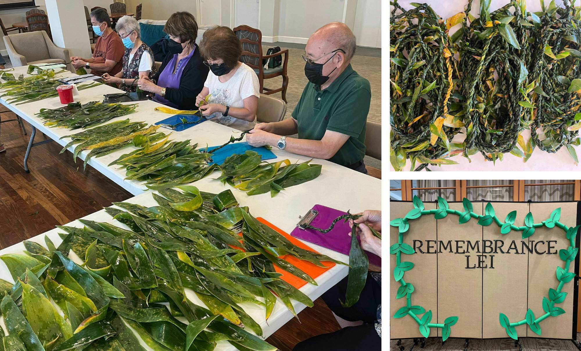 In addition to the fresh lei, the Programs team at Arcadia created a giant ti leaf lei display comprised of leaves that contained remembrances, shared memories and personal messages. The Remembrance Lei provided residents and employees with the opportunity to remember loved ones who are no longer with us.