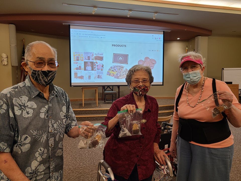 Calling all sweet tooths! 15 Craigside residents didn’t have to go far, but were able to “visit” the Manoa Chocolate Factory in the comfort of the Theater. The virtual excursion included videos about the origins and vision of this local company, now based in Kailua. They even got to see the original equipment and how their craft chocolate is made. Residents ended the tour by picking up samples of three different chocolate bars, and also had the chance to put in an order for more tasty sweets. Yum!