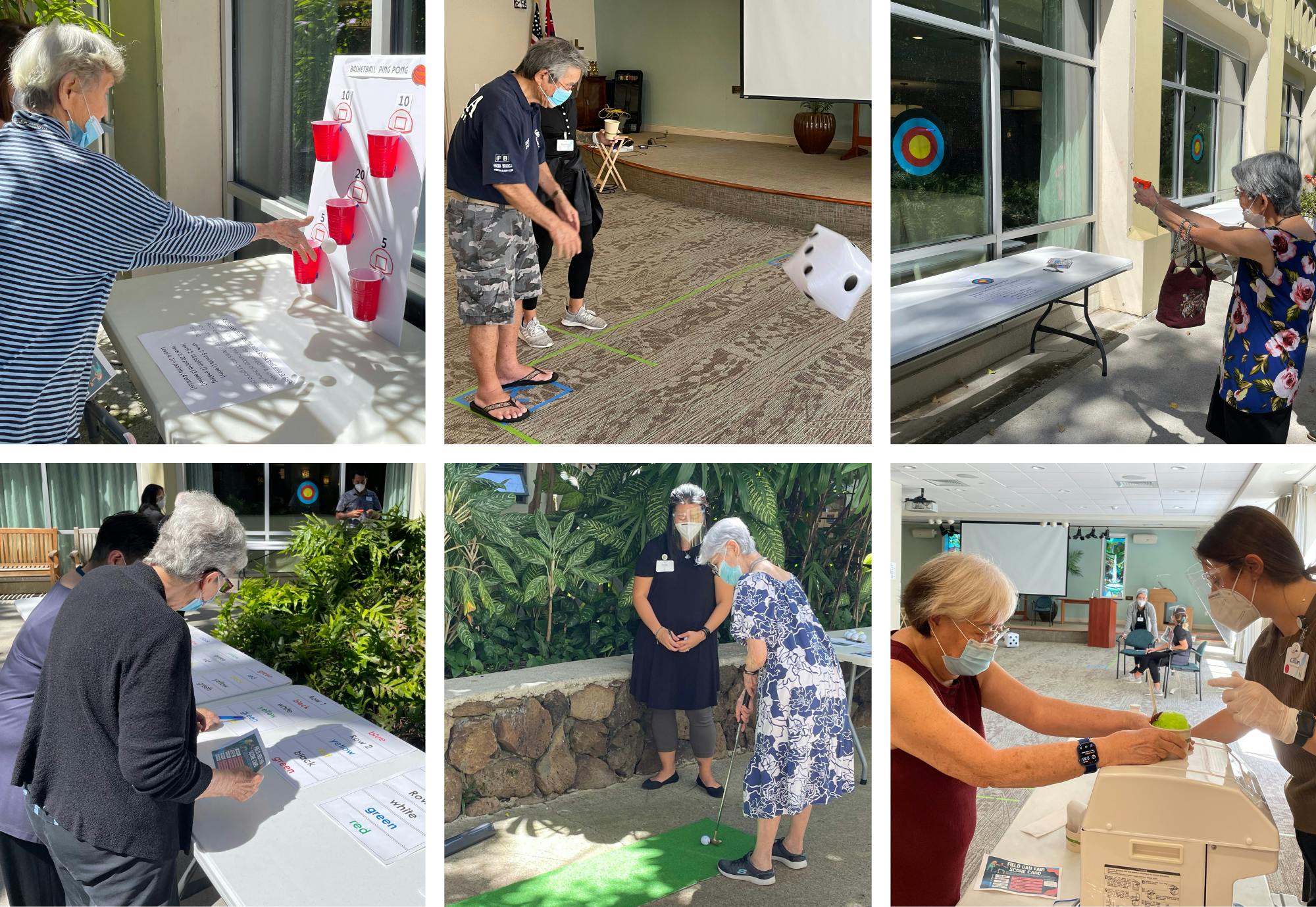 May 25th was National Senior Health and Fitness Day and the residents of Arcadia celebrated with a Field Day Fair. Programs and Wellness co-hosted the event which showed the importance of wellness for ongoing health and illness prevention, all while having fun! Stations were set up in the Garden and Chapel and included a variety of low-impact games such as mini golf, Nerf darts, ping pong basketball, dice baseball, and Stroop effect test, which many residents said was their favorite be-cause it challenged them mentally. Everyone enjoyed the friendly competition and the chance to win a prize. All participants received a refreshing shave ice for a job well done!
