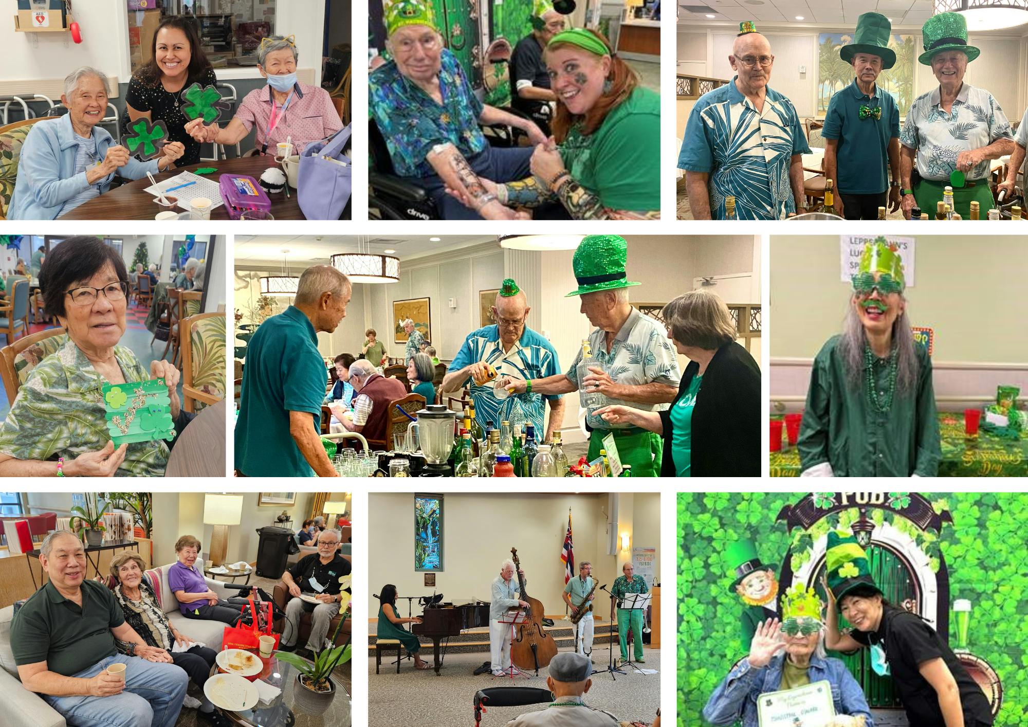 The St. Patrick’s Day celebrations were in full force throughout the Arcadia Family of Companies. At the Arcadia Adult Day Care, clients enjoyed crafting lucky shamrocks, while Hale Ola Kino by Arcadia hosted a Pub Crawl complete with a temporary tattoo parlor, photo booth, games, food, drinks, and crafts. Over at 15 Craigside, the Na Mea Ono “The Delicious Place” Cocktail Hour treated residents to corned beef sliders and potato wedges, all while being entertained by the Little Big Band. Arcadia also celebrated with a festive pop-up bar, where resident Mr. Matt Sgan turned bartender and crafted drinks for residents to enjoy. “May your troubles be less, and your blessings be more, and nothing but happiness come through your door.“