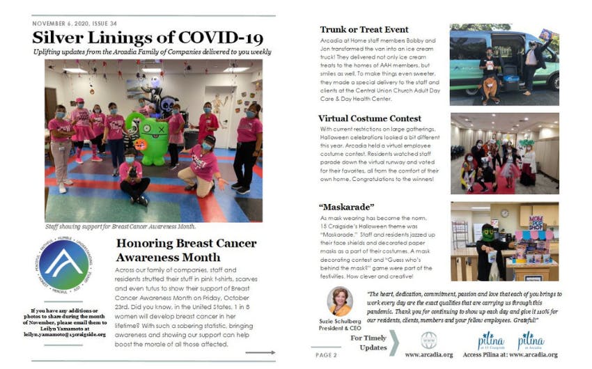 “The heart, dedication, commitment, passion and love that each of you brings to work every day are the exact qualities that are carrying us through this pandemic. Thank you for continuing to show up each day and give it 110% for our residents, clients, members and your fellow employees. Grateful!” - Suzie Schulberg, President & CEO