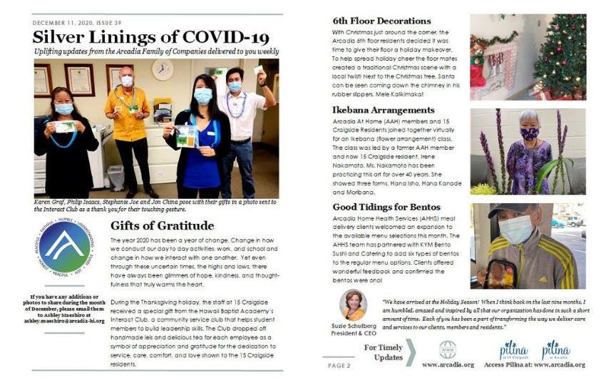 During the Thanksgiving holiday, the staff at 15 Craigside received a special gift from the Hawaii Baptist Academy’s Interact Club, a community service club that helps student members to build leadership skills. The Club dropped off handmade leis and delicious tea for each employee as a symbol of appreciation and gratitude for the dedication to service, care, comfort, and love shown to the 15 Craigside residents.