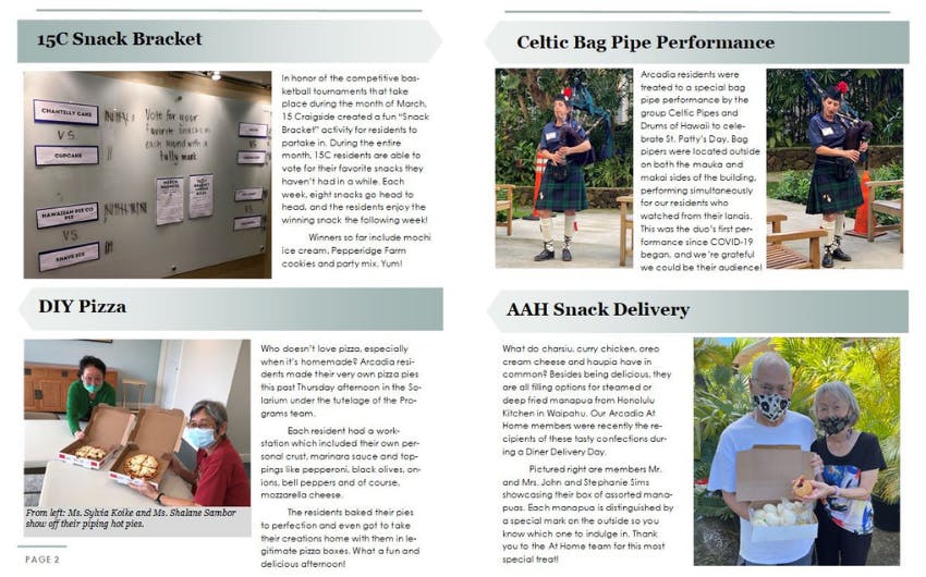 Arcadia residents were treated to a special bag pipe performance by the group Celtic Pipes and Drums of Hawaii to celebrate St. Patty’s Day. Bag pipers were located outside on both the mauka and makai sides of the building, performing simultaneously for our residents who watched from their lanais. This was the duo’s first performance since COVID-19 began, and we’re grateful we could be their audience!