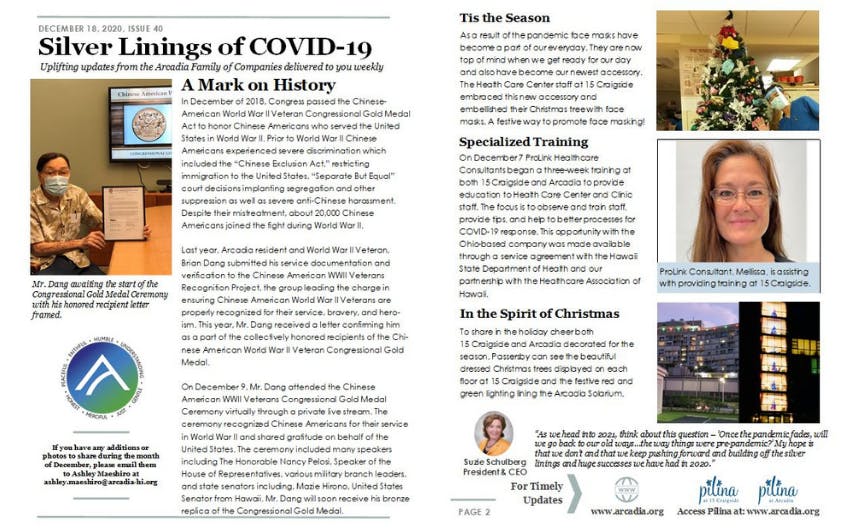 On December 9, Mr. Dang attended the Chinese American WWII Veterans Congressional Gold Medal Ceremony virtually through a private live stream. The ceremony recognized Chinese Americans for their service in World War II and shared gratitude on behalf of the United States. The ceremony included many speakers including The Honorable Nancy Pelosi, Speaker of the House of Representatives, various military branch leaders, and state senators including, Mazie Hirono, United States Senator from Hawaii. Mr. Dang will soon receive his bronze replica of the Congressional Gold Medal.