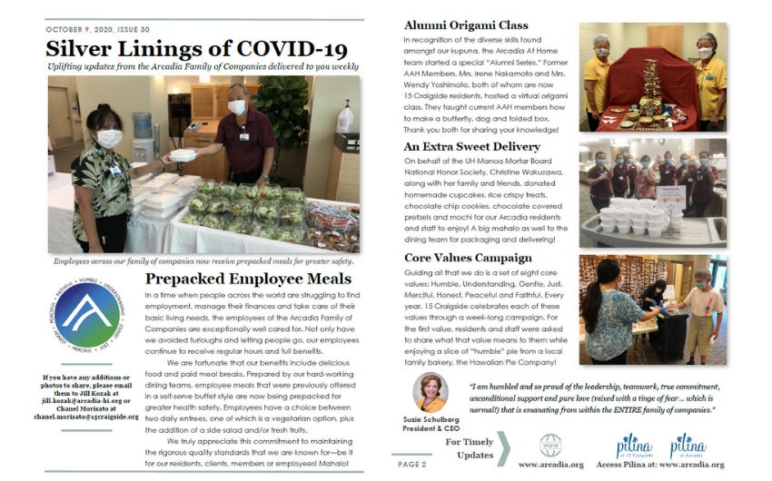 In a time when people across the world are struggling to find employment, manage their finances and take care of their basic living needs, the employees of the Arcadia Family of Companies are exceptionally well cared for. Not only have we avoided furloughs and letting people go, our employees continue to receive regular hours and full benefits.