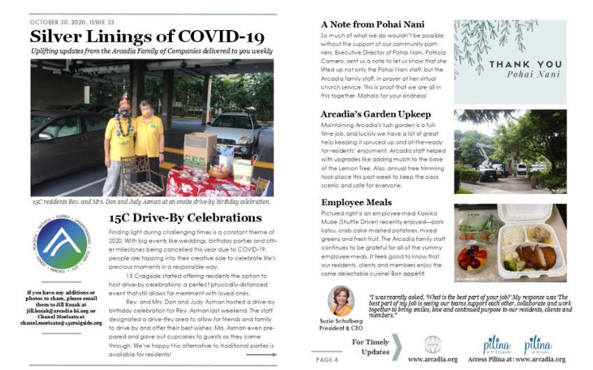 So much of what we do wouldn’t be possible without the support of our community partners. Executive Director of Pohai Nani, Patricia Camero, sent us a note to let us know that she lifted up not only the Pohai Nani staff, but the Arcadia family staff, in prayer at her virtual church service. This is proof that we are all in this together. Mahalo for your kindness!