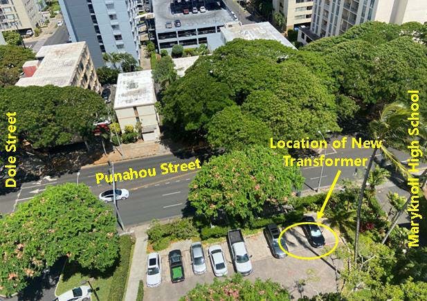 Arcadia will begin its 7 month Transformer Replacement & Relocation Project on Tuesday, July 6th. The transformer is currently located in the basement of Arcadia. The current transformer will be removed and disposed of. A new transformer will be installed on the exterior of the building on the gravel lot that runs parallel to the bus stop fronting the property on Punahou Street. (See picture on back page).